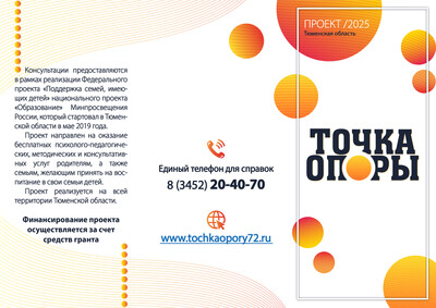 Кроме того, помочь семьям в преодолении трудностей могут специалисты региональной службы психологической поддержки населения «Точка опоры», открывшей консультационные пункты по всей территории Тюменской области. Специалисты в различных областях (психологи, специалисты по социальной работе, логопеды, дефектологи, педагоги) бесплатно консультируют родителей по вопросам воспитания и обучения детей. Записаться к специалисту можно на сайте tochkaopory72.ru или по телефону 8(3452)20-40-70.